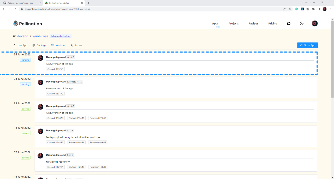 In this section, we will see how we can deploy an app on Pollination by triggering a release on Github.