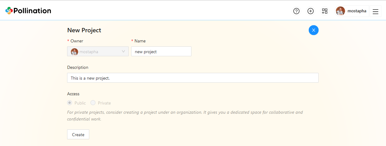 *Private projects are only available to organizations. All the projects under the personal accounts will be public, and visible on Pollination.*